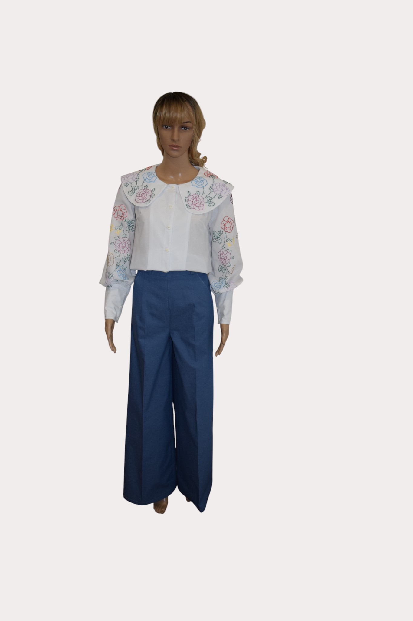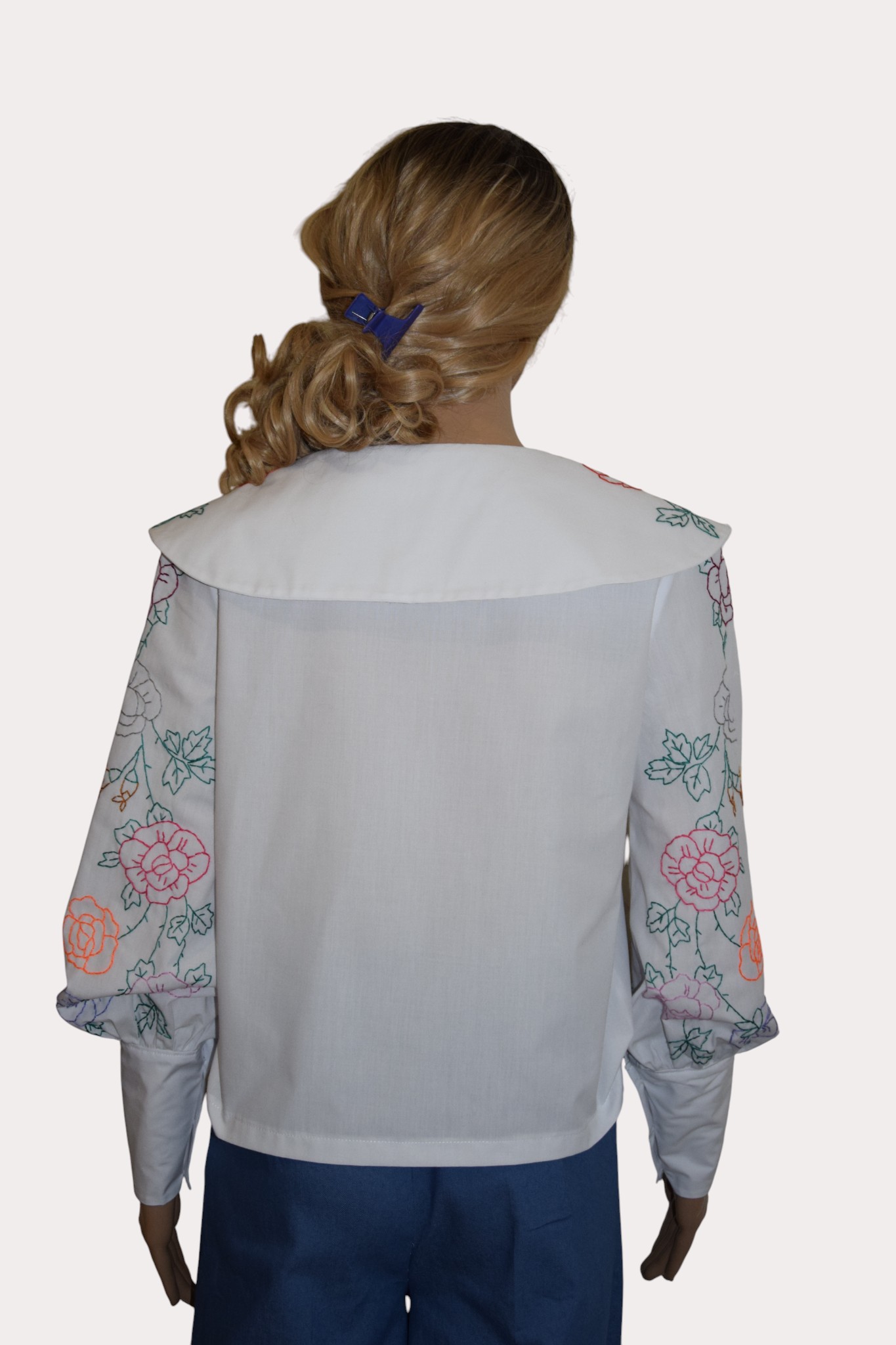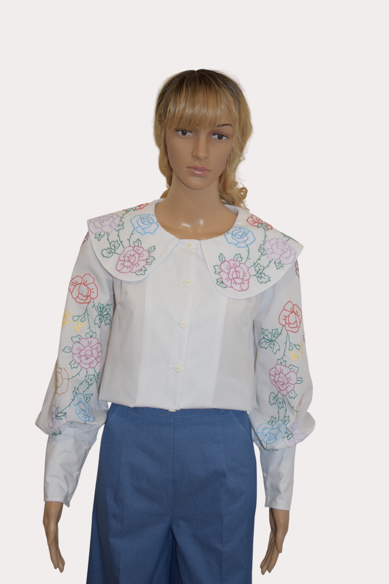 Chemise en coton de couleur blanche boutonnée devant, avec col Claudine rond , manches bouffantes , broderies cousu manuellement sur les manches et le col, motifs fleurs.