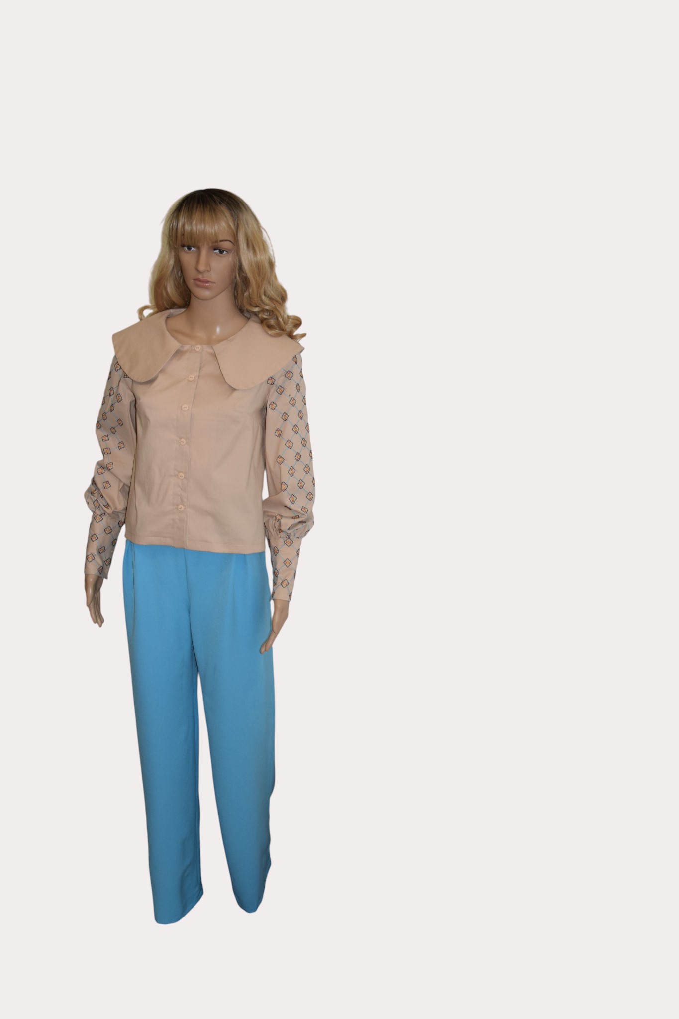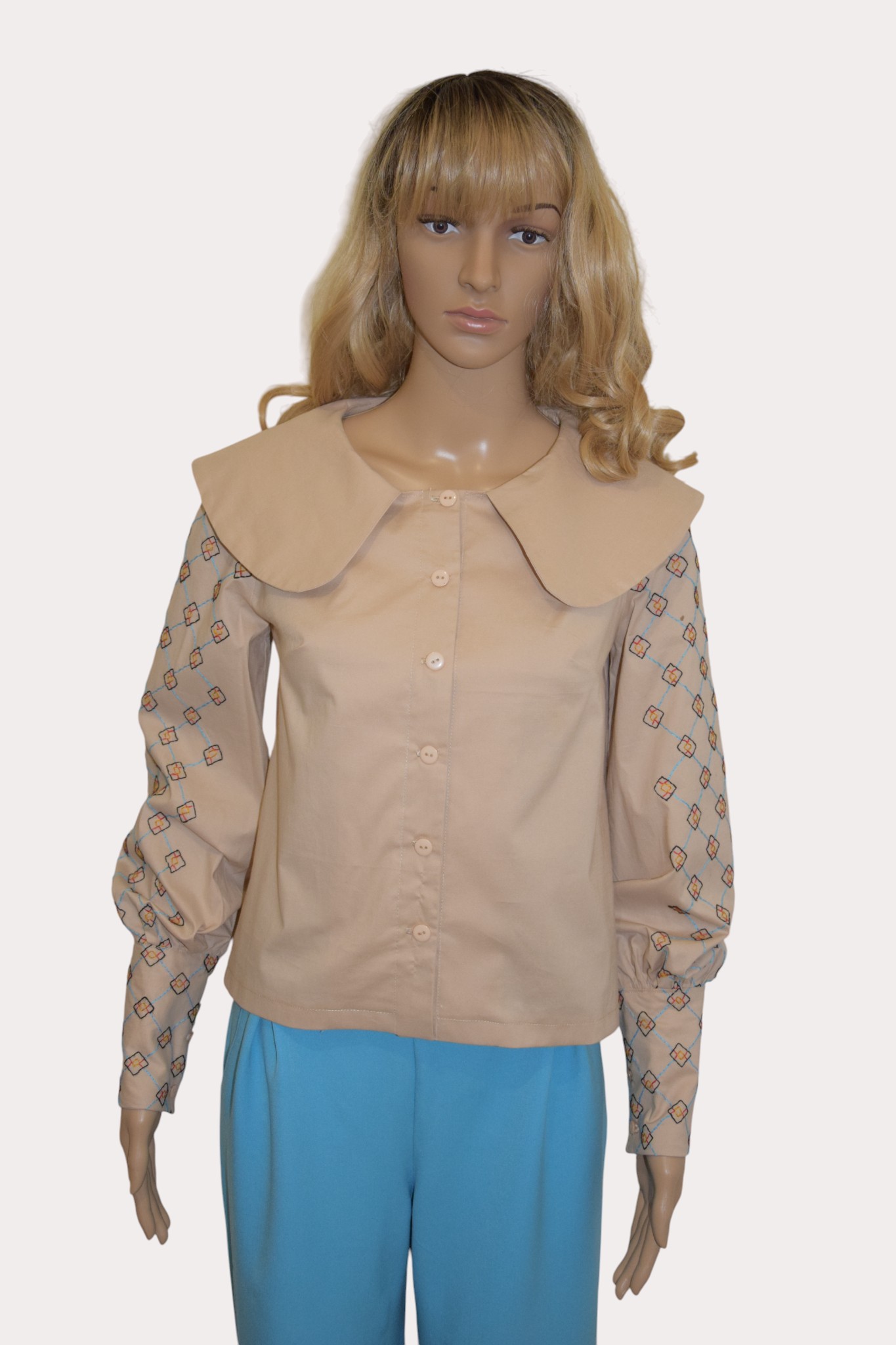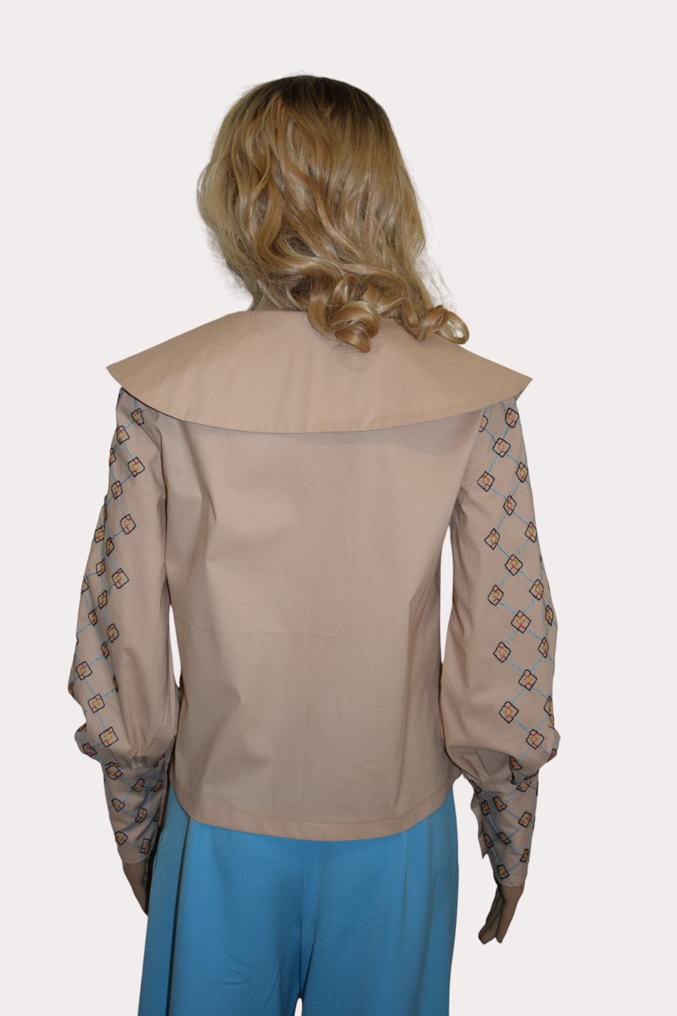 Chemise en coton de couleur beige boutonnée devant, avec col Claudine rond , manches bouffantes , broderies cousu manuellement sur les manches et poignée .