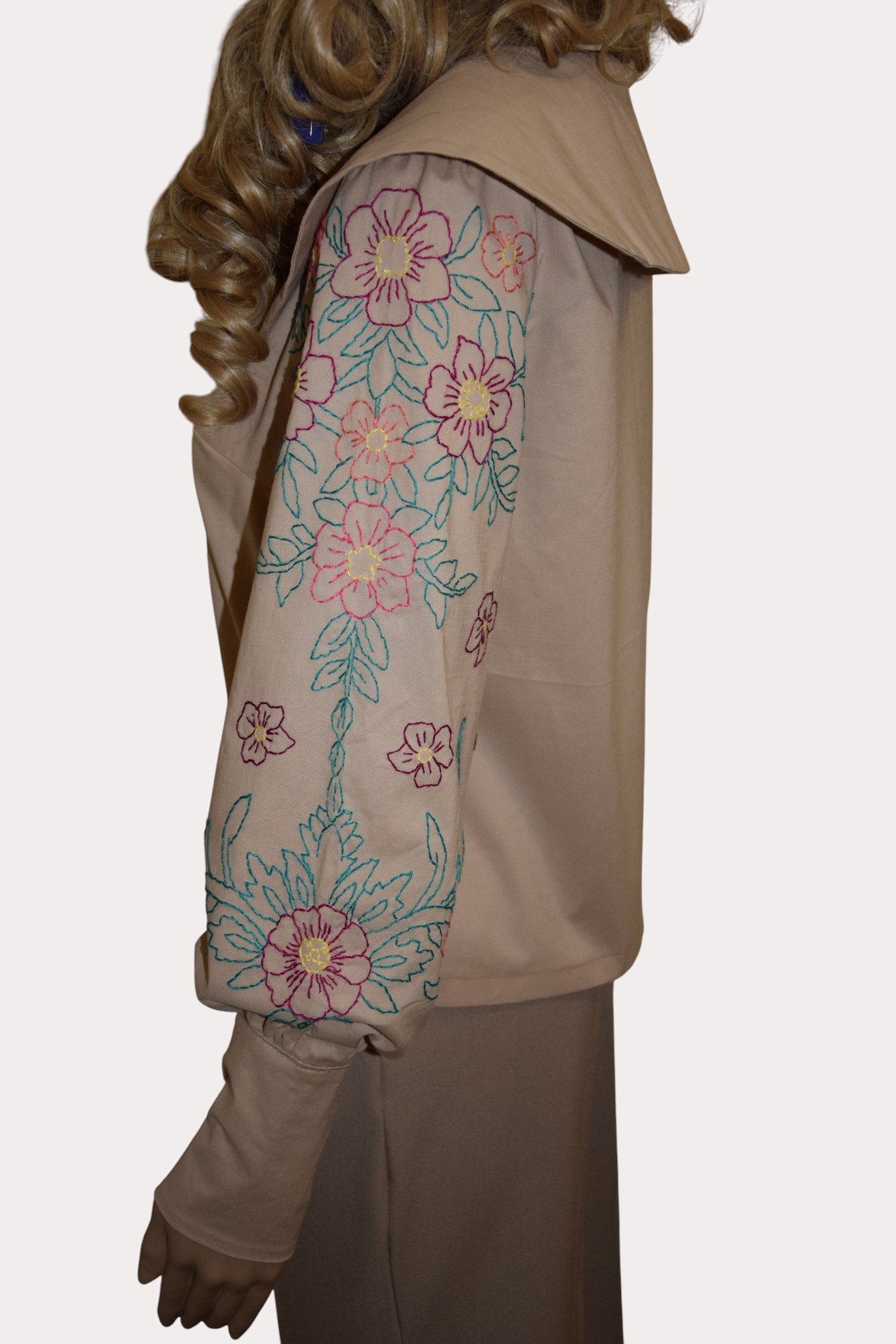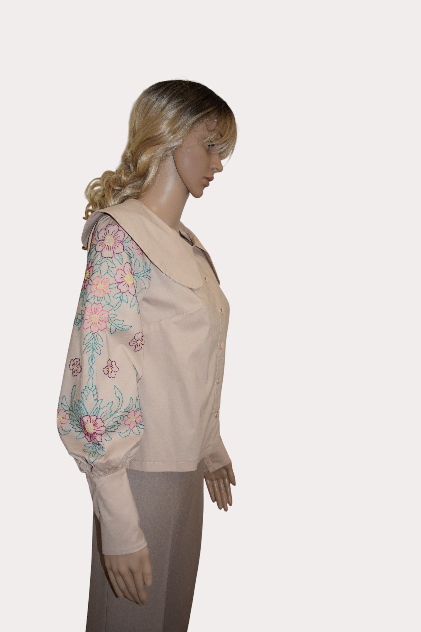 Chemise en coton de couleur beige boutonnée devant, avec col Claudine rond , manches bouffantes , broderies cousu manuellement sur les manches , motifs fleurs.