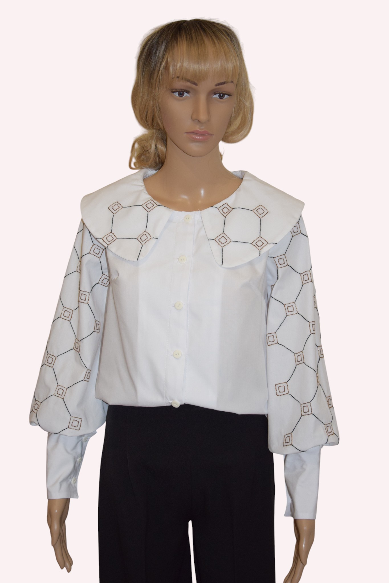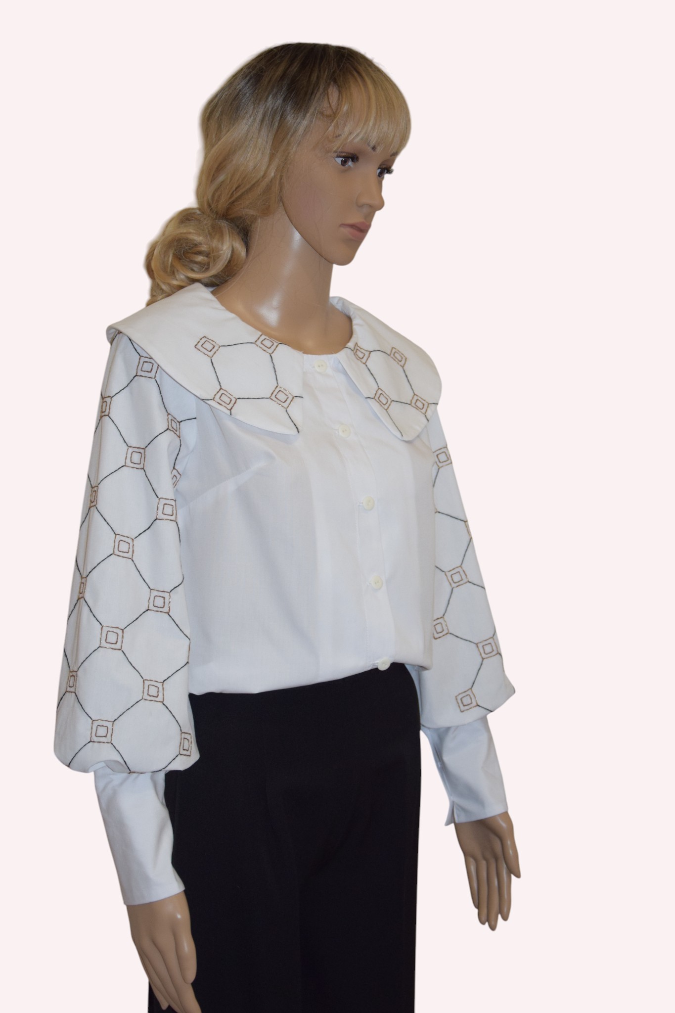 Chemise en coton de couleur blanche boutonnée devant, avec col Claudine , manches bouffantes , broderies cousu manuellement sur les manches et le col de couleur noir, caramel et fil dore .
