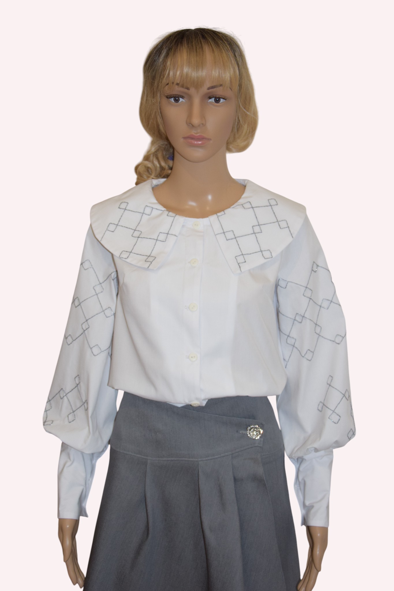 Chemise en coton de couleur blanche boutonnée devant, avec col Claudine , manches bouffantes , broderies cousu manuellement sur les manches et le col de couleur gris .