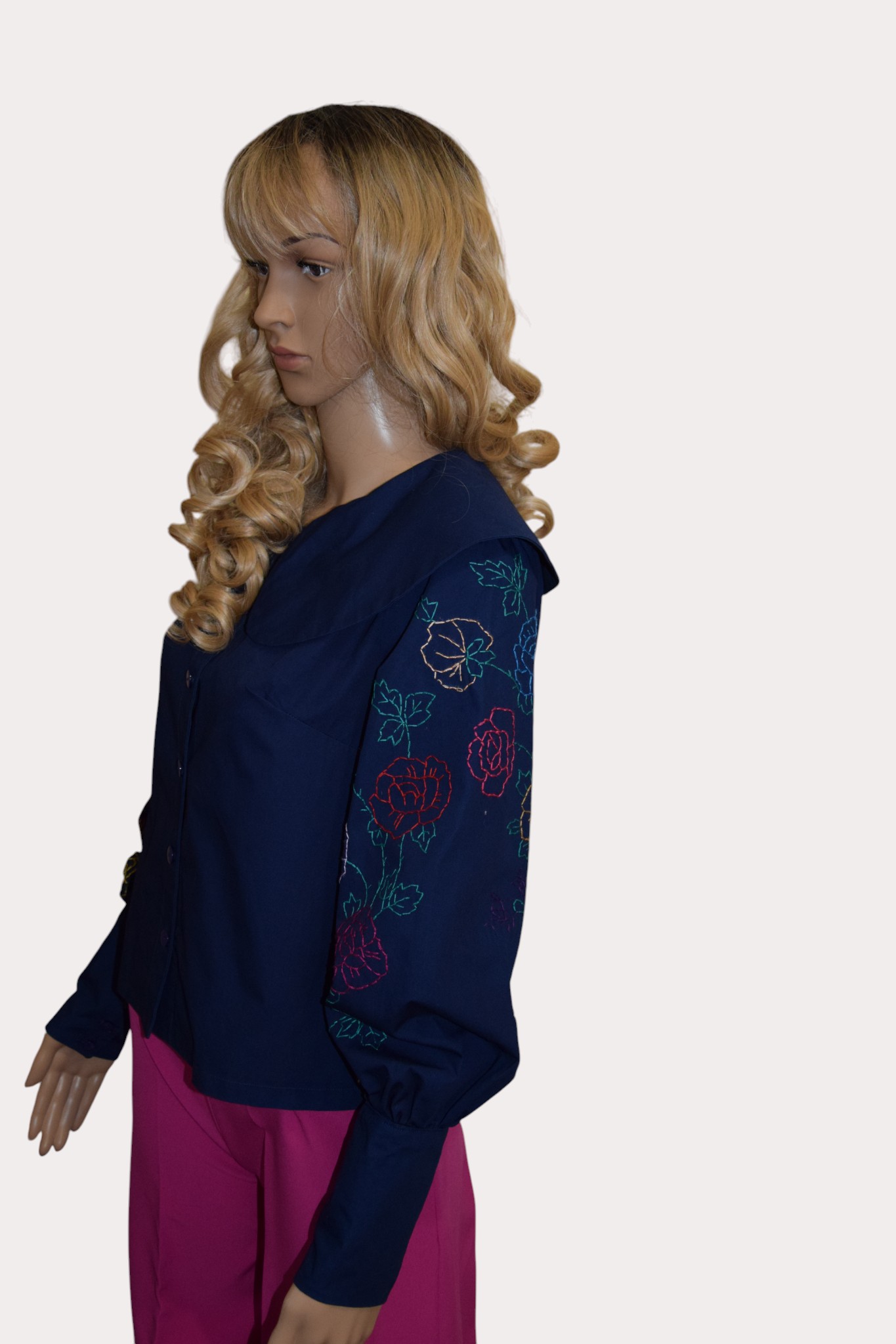 Chemise en coton de couleur bleu marin boutonnée devant, avec col Claudine rond , manches bouffantes , broderies cousu manuellement sur les manches, motifs fleurs.