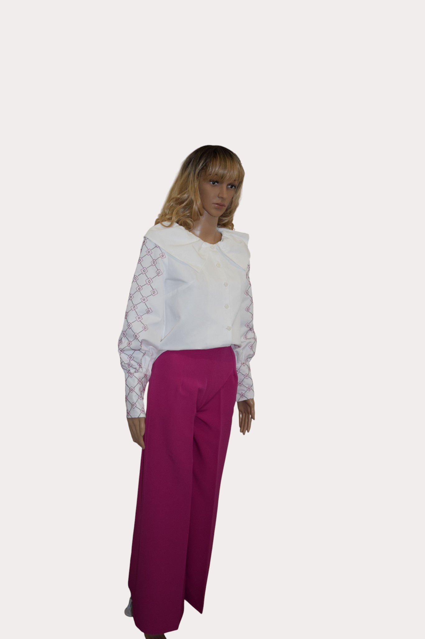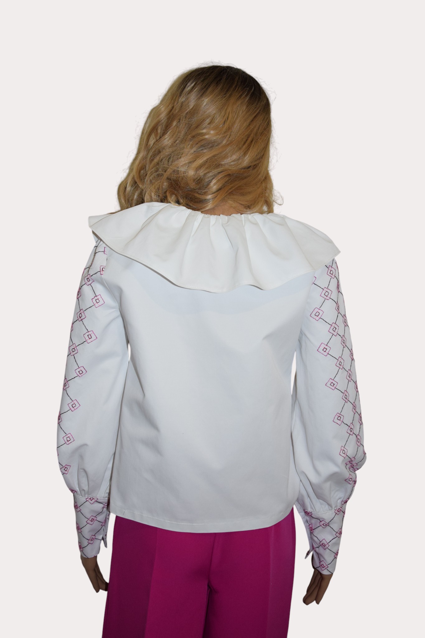 Chemise en coton de couleur blanche boutonnée devant, avec col, manches bouffantes , broderies cousu manuellement sur les manches et les poignées , motifs fleurs.