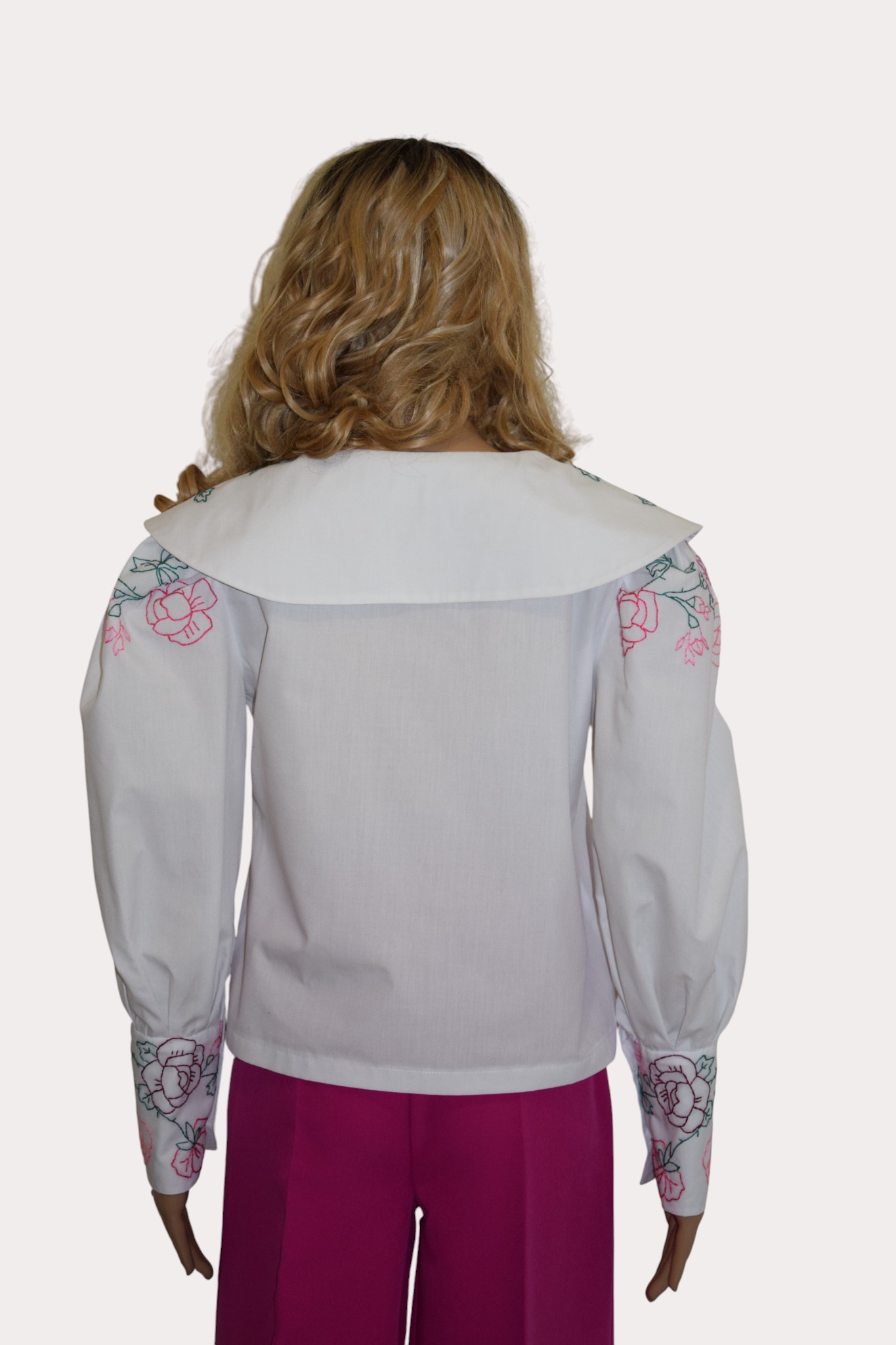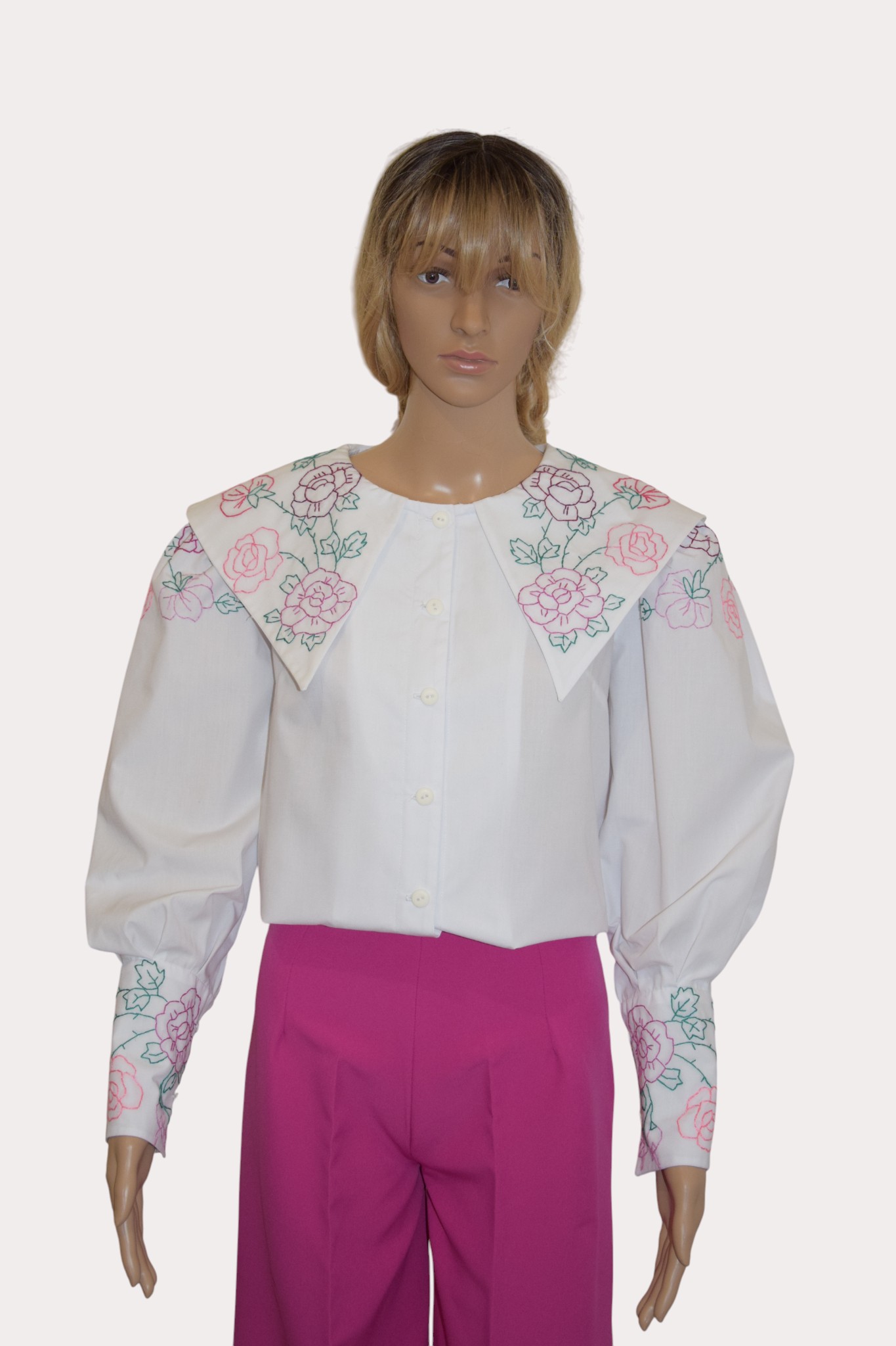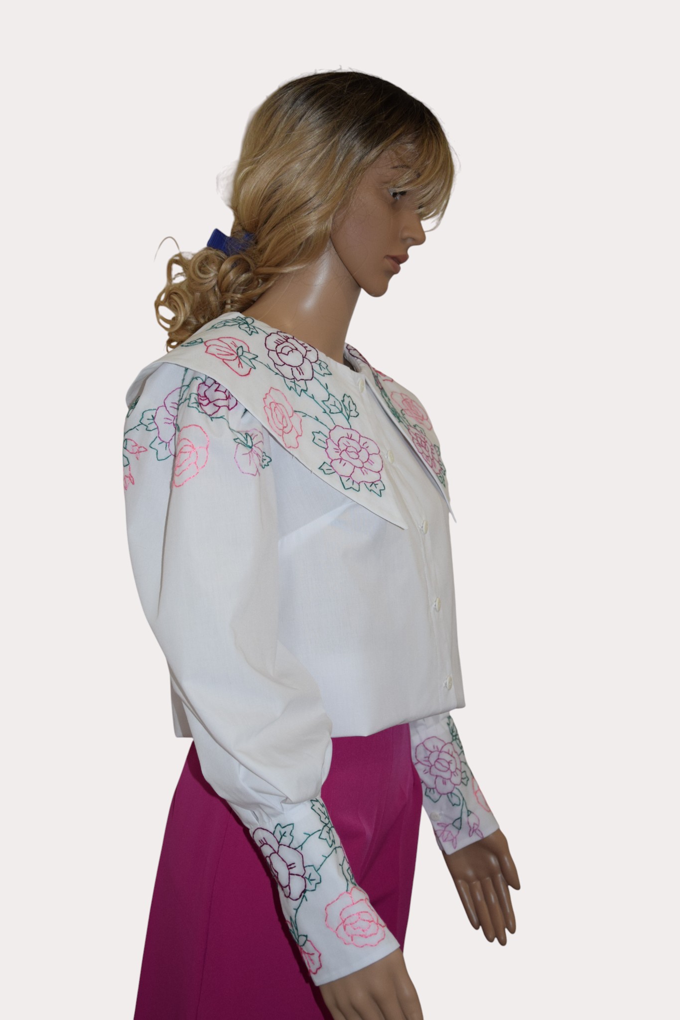 Chemise en coton de couleur blanche boutonnée devant, avec col Claudine , manches ballon avec plis en haut et en bas de la manche, broderies cousu manuellement sur les manches, le col et les poignées, motifs fleurs.