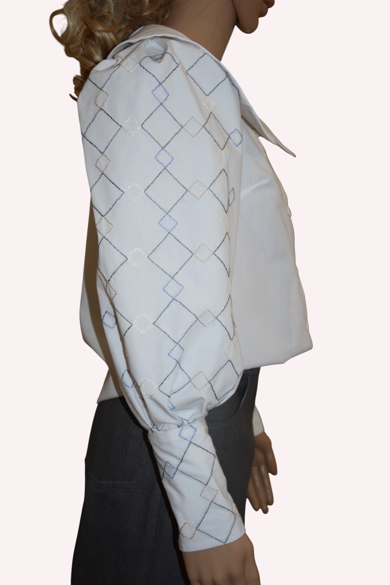 Chemise en coton de couleur blanche boutonnée devant, avec col Claudine , manches ballon , broderies cousu manuellement sur les manches et le col de couleur bleu, écru et gris .