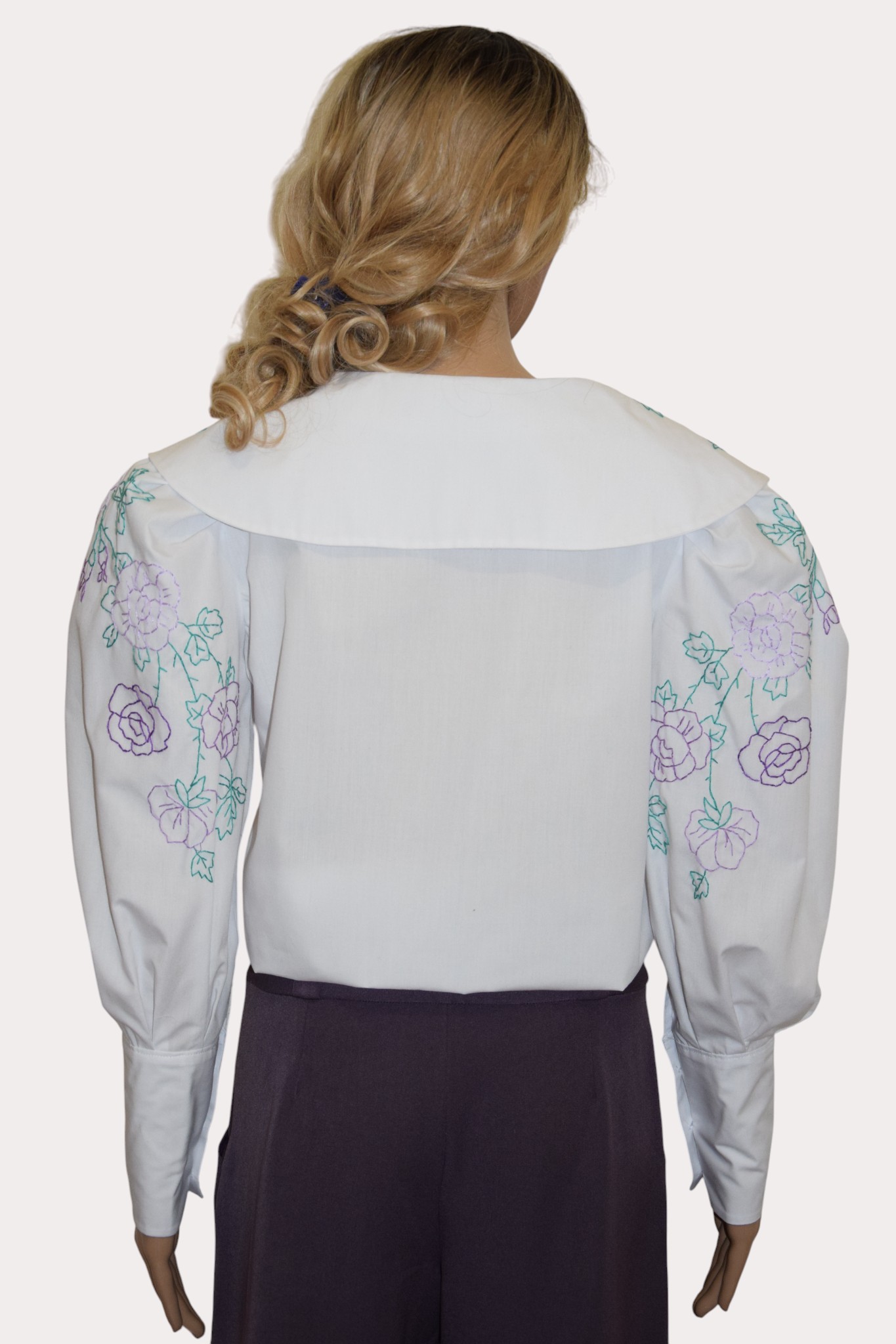 Chemise en coton de couleur blanche boutonnée devant, avec col Claudine , manches ballon avec plis en haut et en bas de la manche, broderies cousu manuellement sur les manches et le col , motifs fleurs.