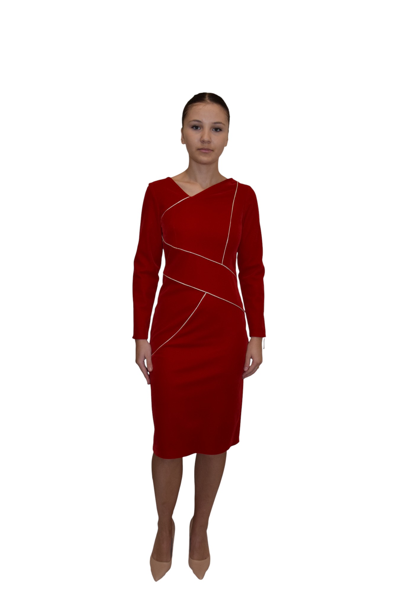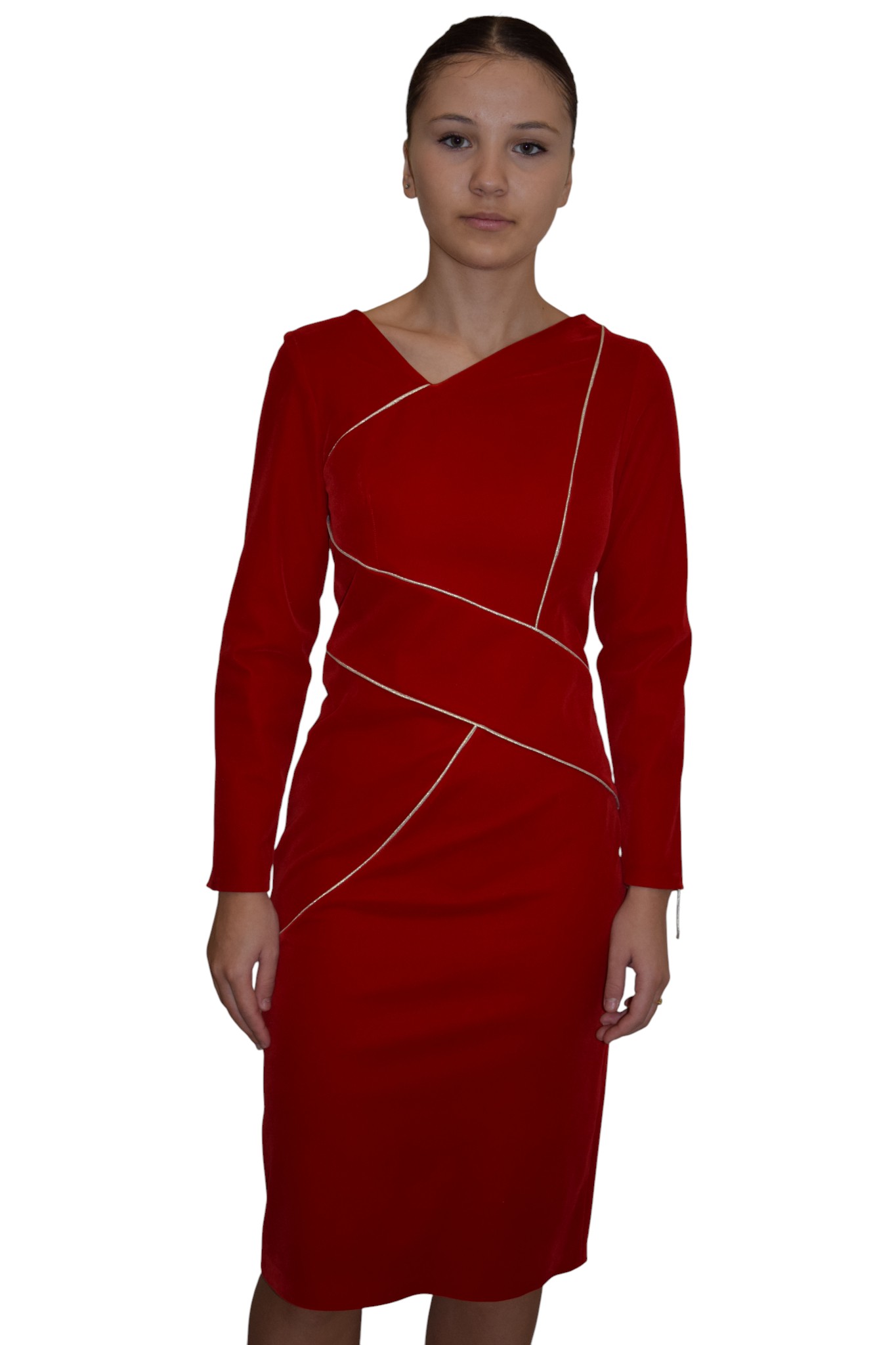 Robe en velours de couleur rouge sans col ,manches longues, coupe droite