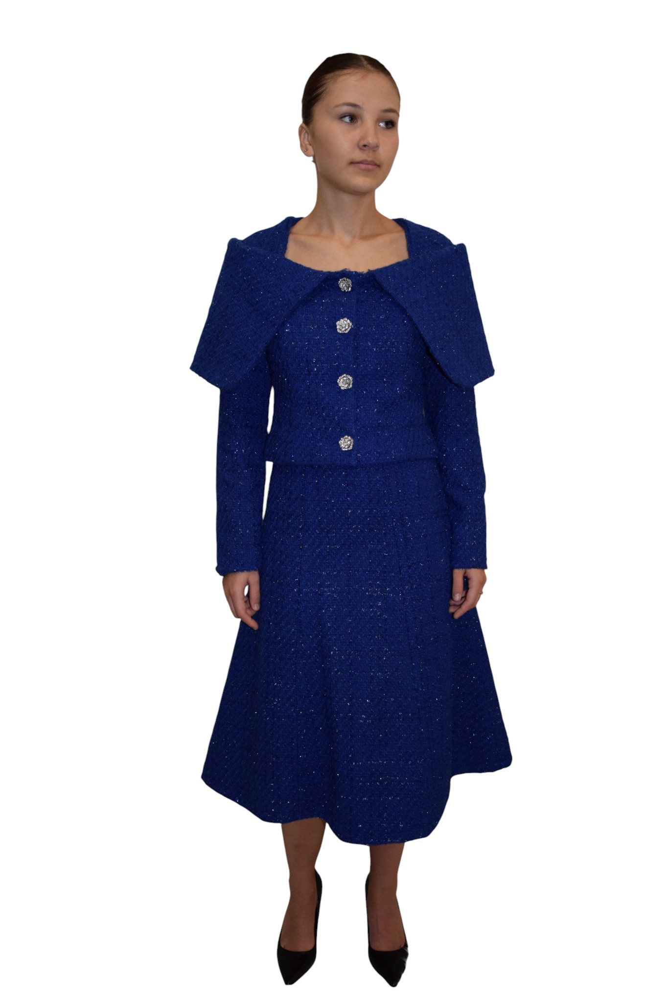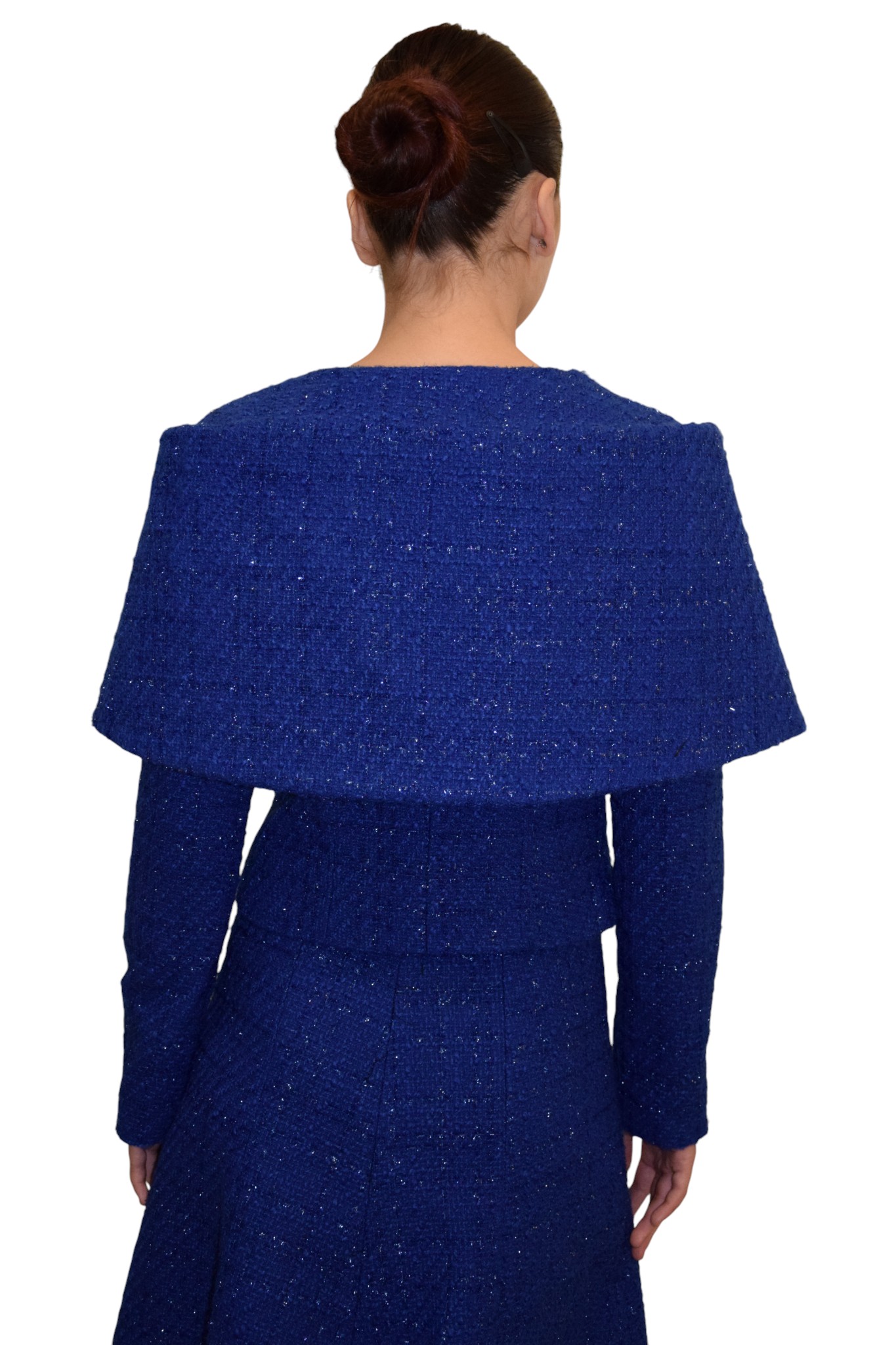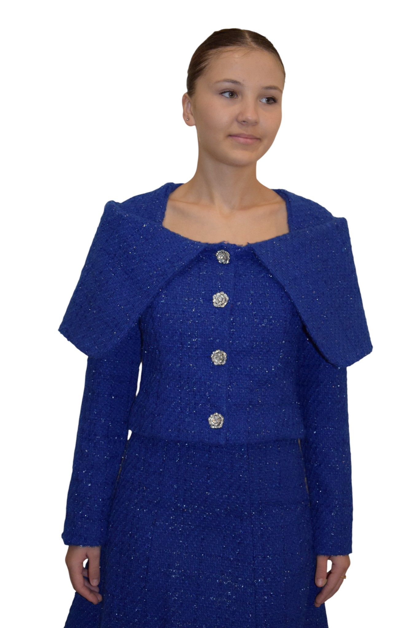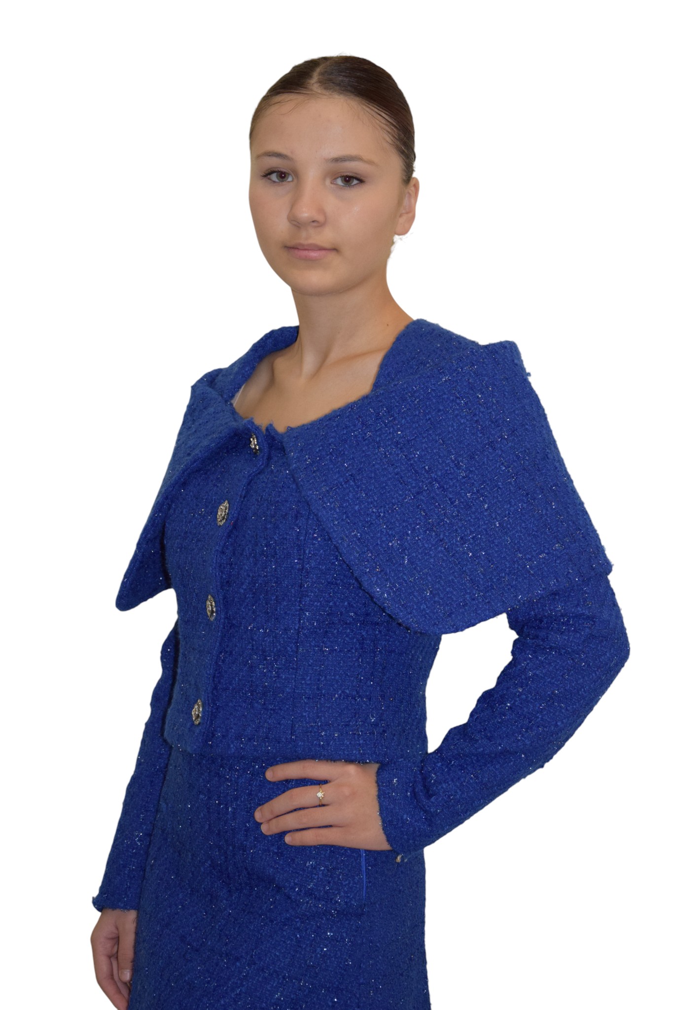Haut en tweed de couleur bleu royal avec col ,double , manches longues , sans poches, boutonnée devant