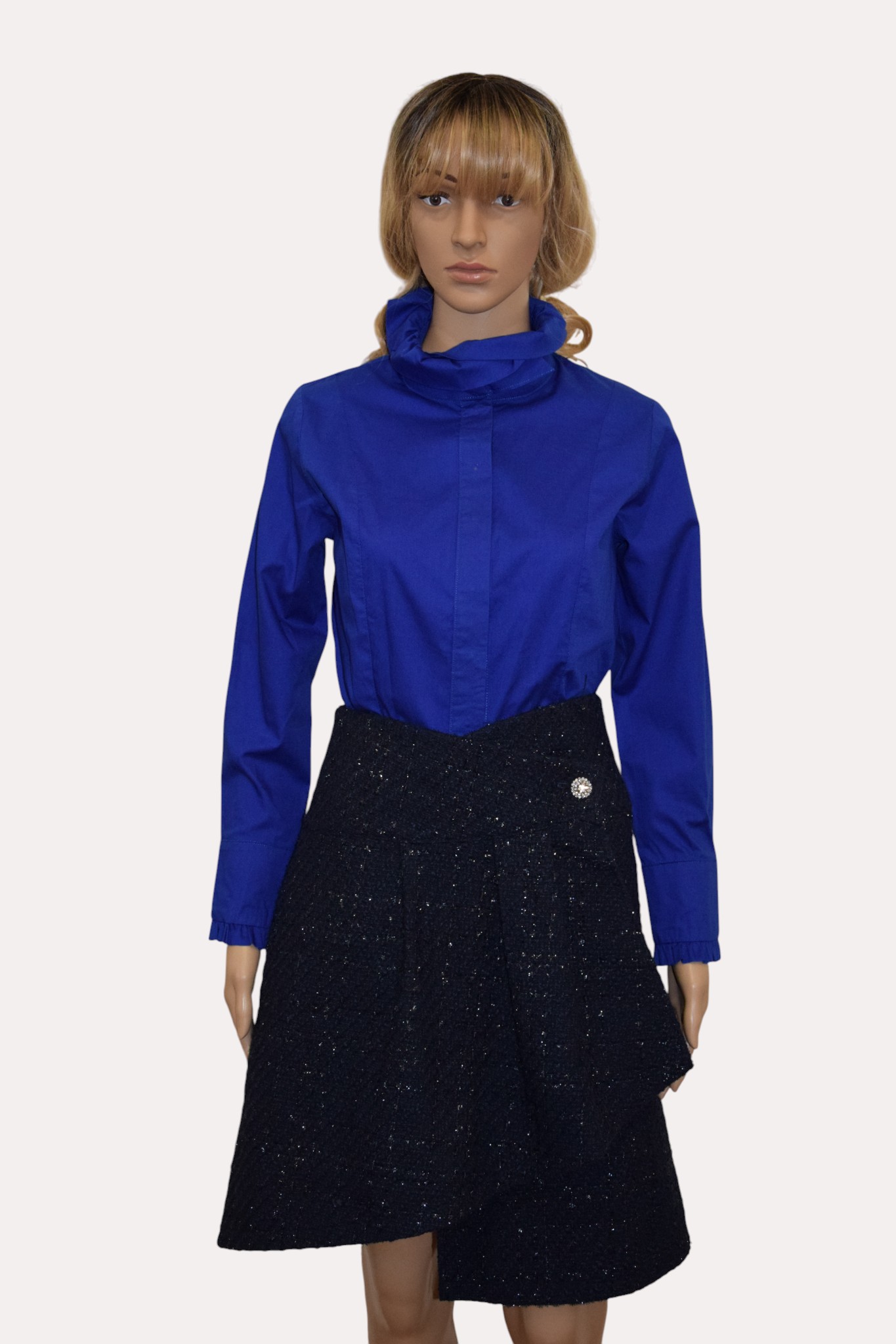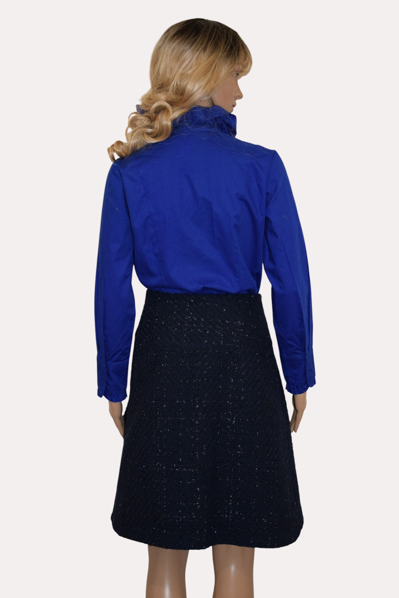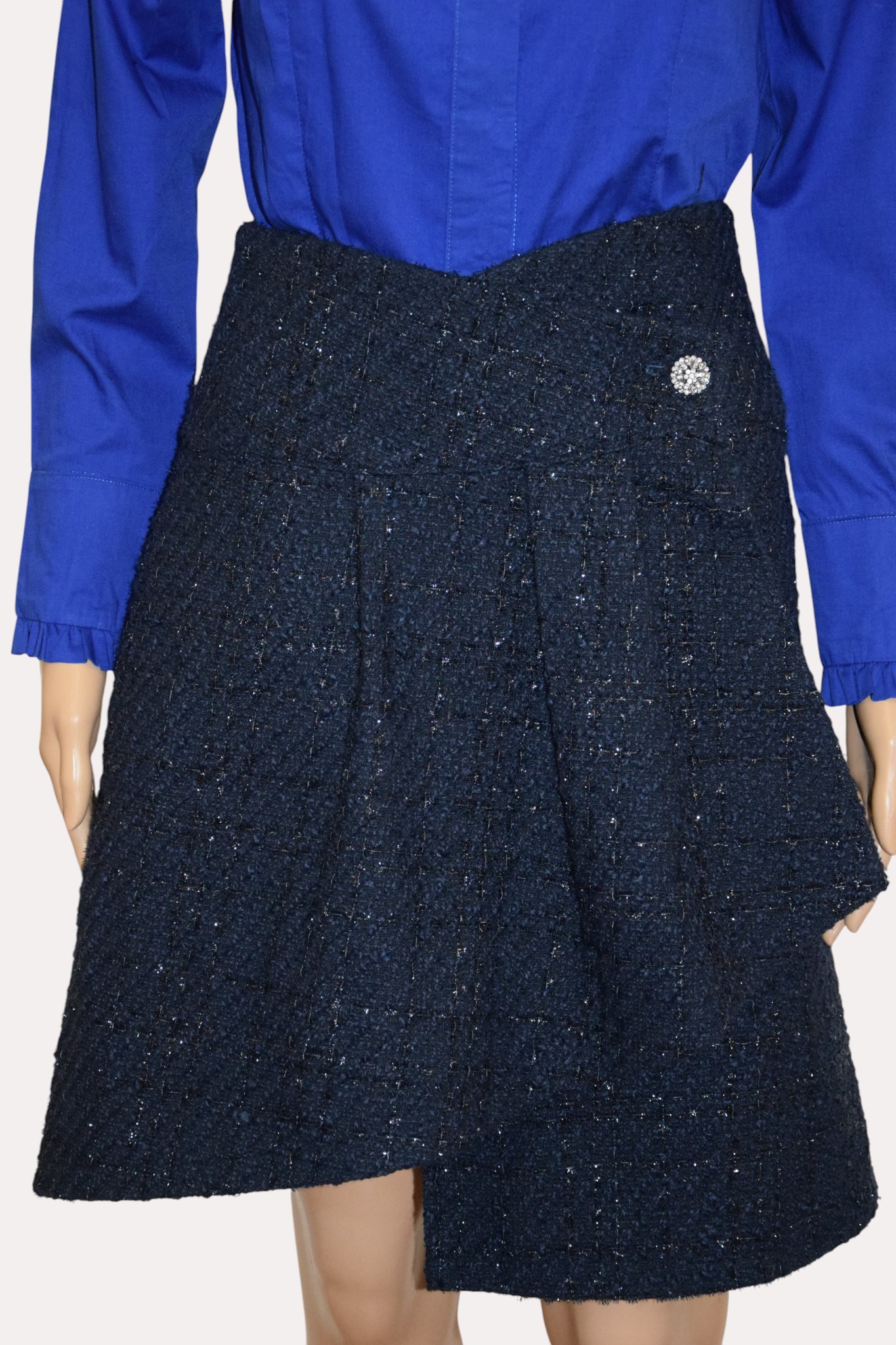 Jupe portefeuille en tweed de couleur bleu marin , peu évasée avec plis devant et taille. Deux boutons, un a l’intérieur et un a l’extérieur. Sans poches