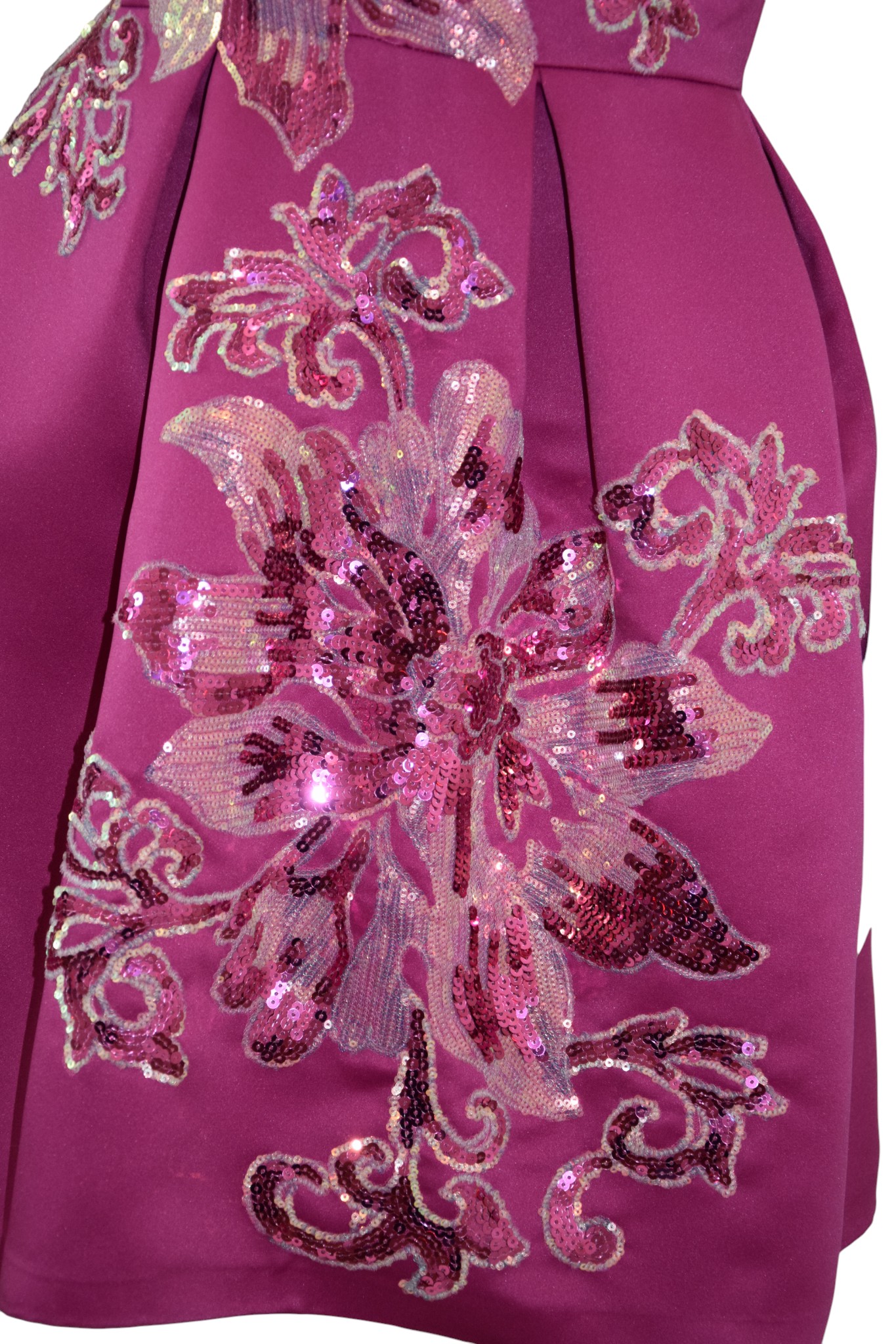 Robe en satin duchesse de couleur fuchsia magenta peu évasée avec deux plis devant et derrière, fermeture invisible derrière, avec doublure .
